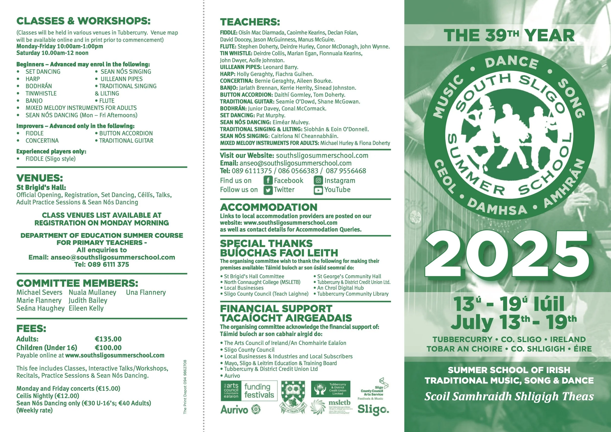 The name Junior Davey is synonymous with bodhrán and bones playing in traditional Irish music circles and Junior’s longstanding dedication to his art is deeply rooted in a sense of place and a great understanding of the musical legacy he is steeped in and has been surrounded by all his life. A native of Clooneigh, Gurteen, Junior’s dad Andy was a fiddle player with his own distinctive style but very much reflecting the style of the area of Gurteen and South Sligo. This Wednesday afternoon presentation will put the spotlight on the percussive interpretation of the music and tunes and will be a fitting interlude during this year’s summer school, sitting perfectly between the much anticipated Tribute Concert on Monday night honouring Junior Davey’s legacy over many years as tutor and the Thursday evening recital, featuring Junior and his Bodhrán class – always a highlight of the week.